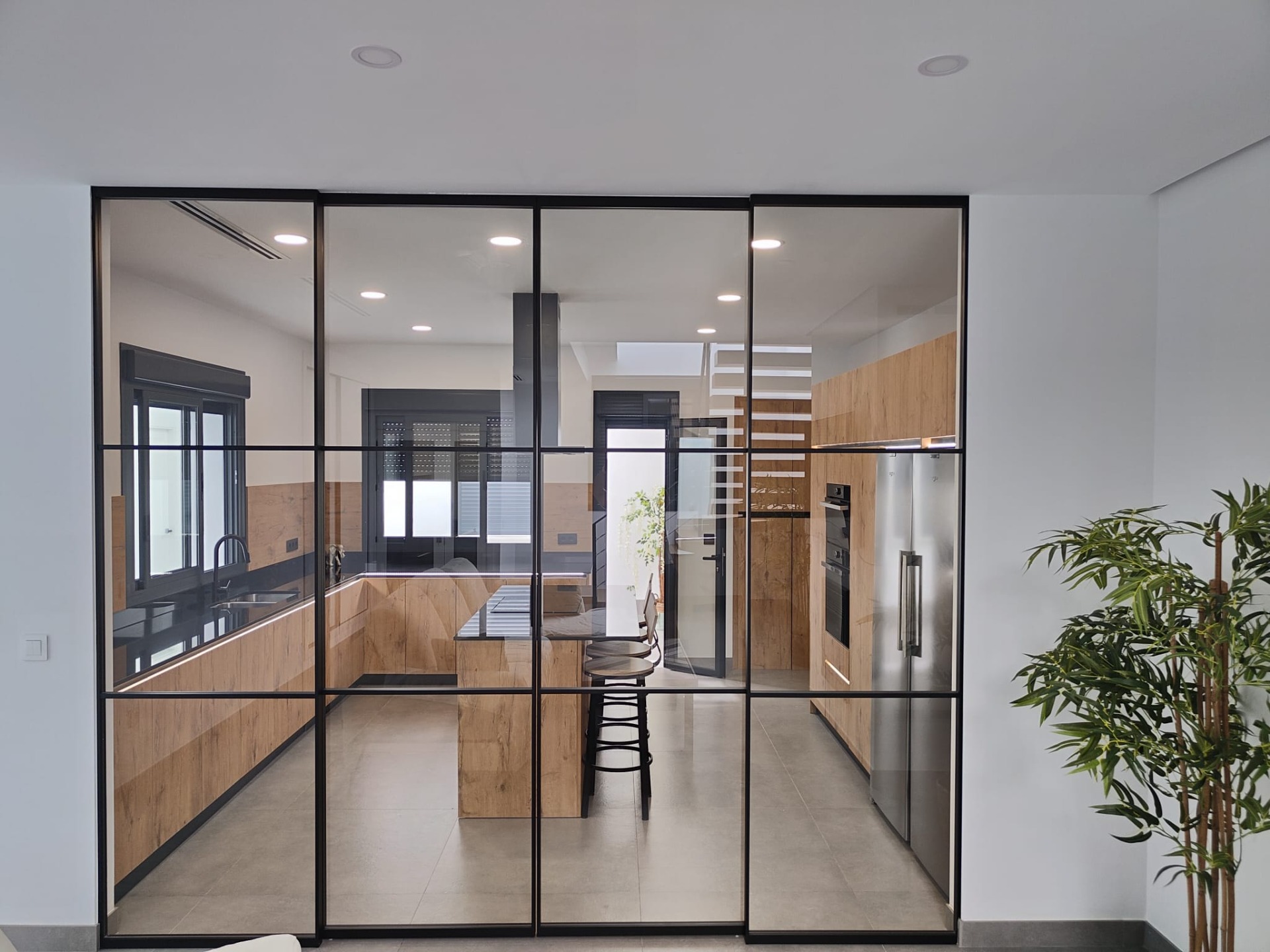 PUERTA CORREDERA 4 HOJAS ENTRE PILARES, TODO CRISTAL,2 GUIAS A TECHO PLUS DE 4 METROS.